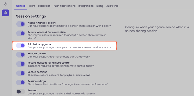 Note: if full device mode is toggled off outside of the webpage or application on which the session was first initiated, then this will disrupt the agent's view of the end user's device.