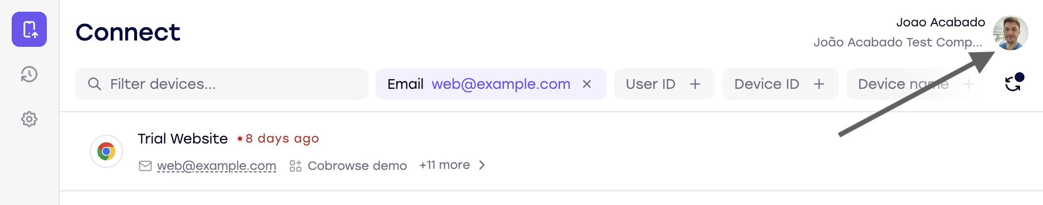 If your email address is associated with multiple accounts (e.g. development and production) then you may need to switch between accounts within the Cobrowse.io dashboard.